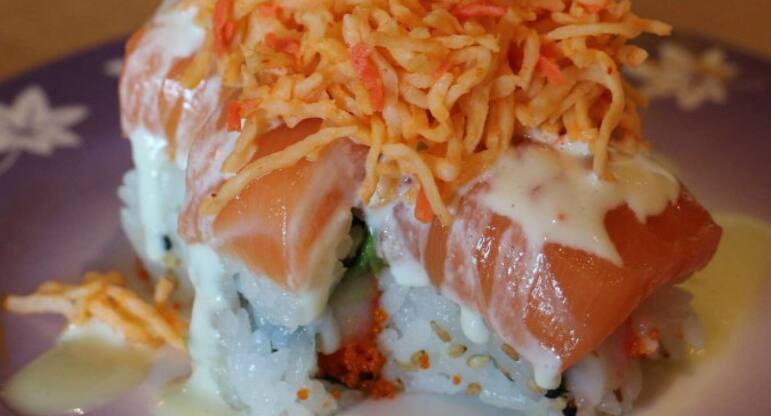 Fresh salmon avocado cream cheese and crab roll deep fried served with eel sauce and spicy mayo on top.